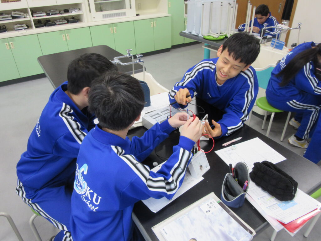 2年生の理科では、電力について勉強しました。今日は、抵抗の大きさが違う電熱線を使って水を温めたときの、水温の変化を調べる実験を行いました。水温が、温める前と比べて20℃近く上昇した結果に驚く生徒がみられました。
