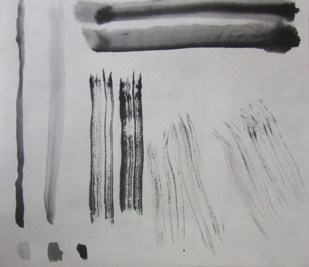 2年生の水墨画の授業です。今日は、筆につける墨や水の量を変えたときの表現方法について勉強しました。とても味のある線を書いていました。