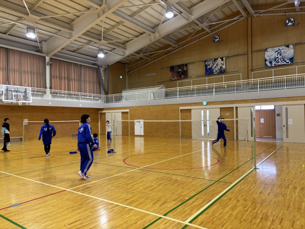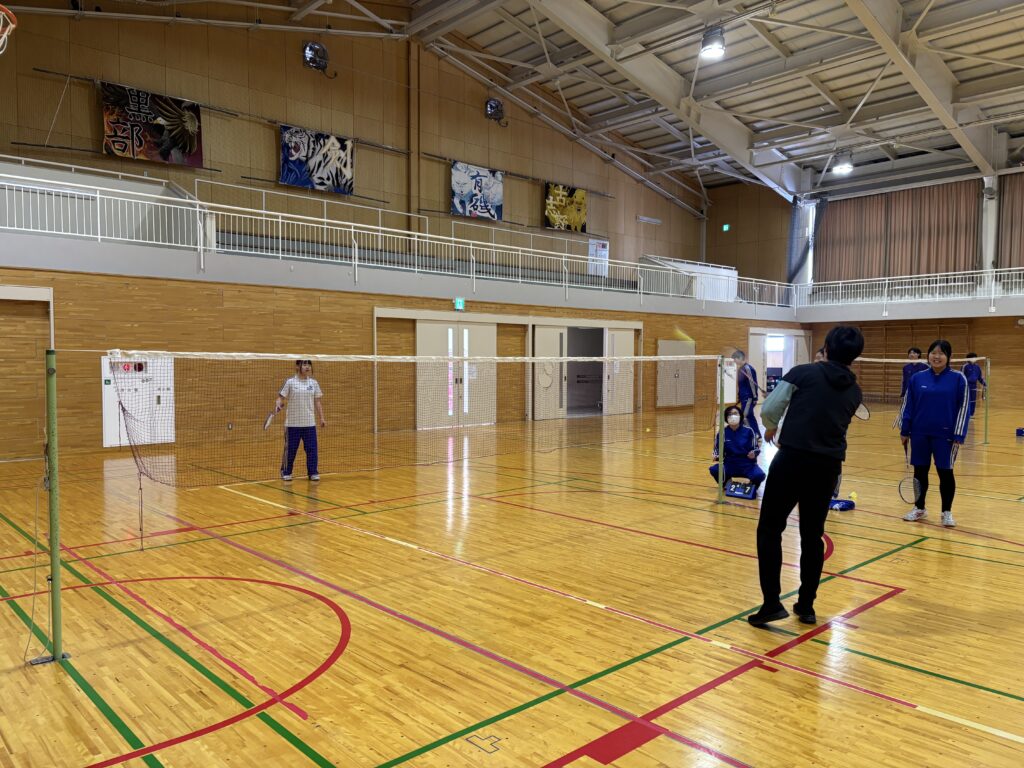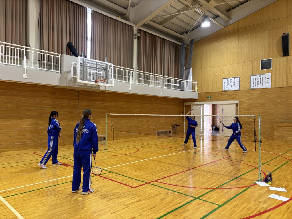 3年生は保健体育の授業でバドミントンをしています。シングルスをしたり、ダブルスをしたり…。クラスメイトと白熱した試合をしていました。中には、先生に対戦を挑んでいる姿も。