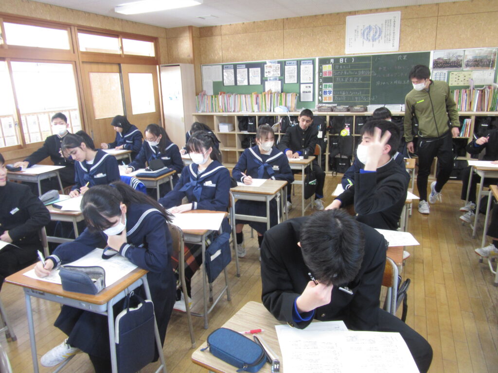 また3時間目には、3学期期末考査の範囲が発表されました。範囲表を見ながら、さっそく今日の分からの計画表を作成しました。期末考査は、2月20日(金)、24日(火)、25日(水)に行われます。明日の祝日を有効に活用しましょう。