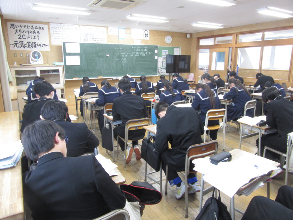 2月5日(木)に、2年生は実力テストを行いました。入試と同じ40点満点のテストを、1日で5教科受けまました。時間いっぱいまで、粘り強く取り組む姿がみられました。